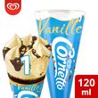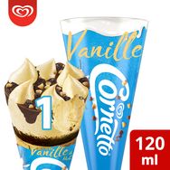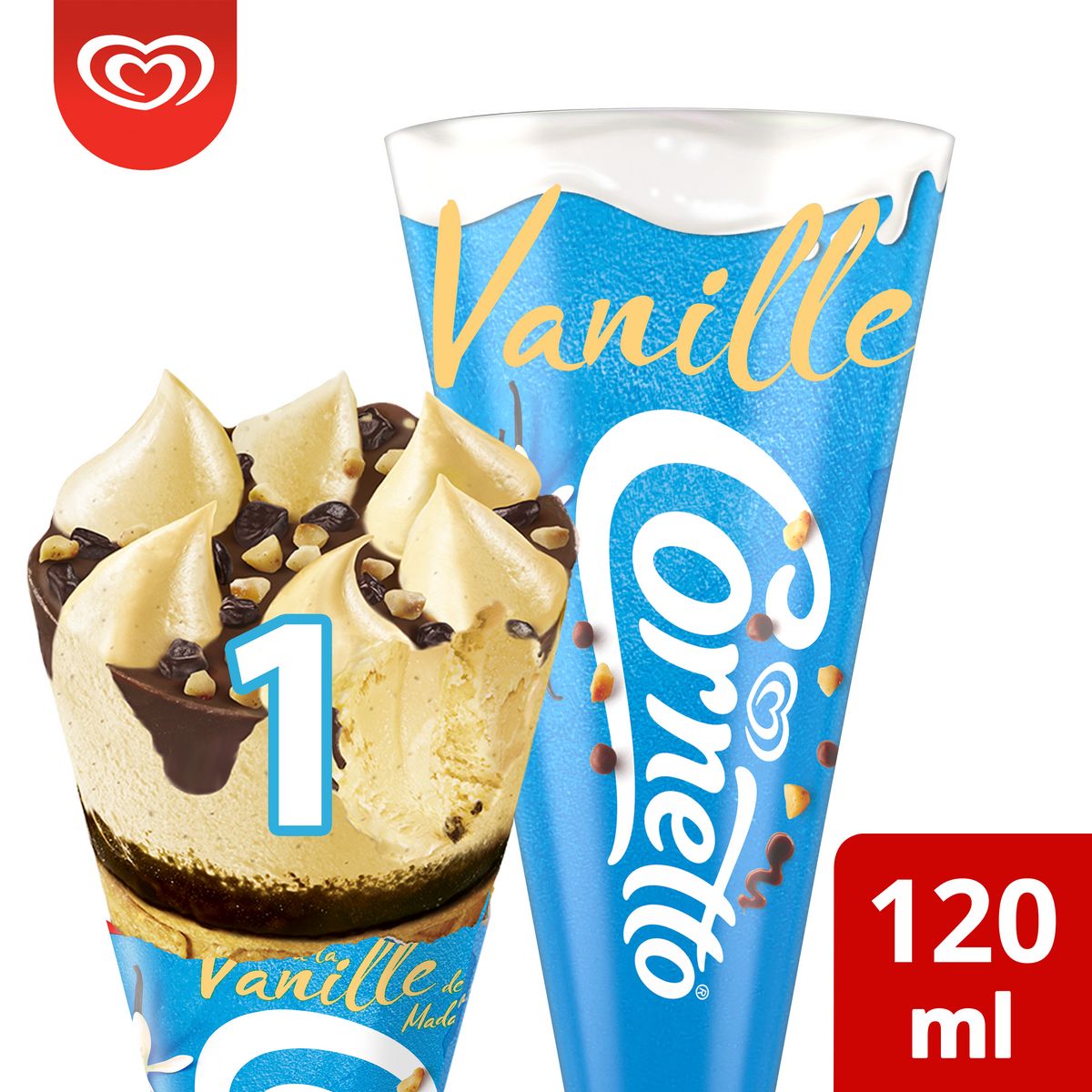 Crème glacée vanille dans une gaufrette (18%) avec un enrobage au cacao maigre (8%) avec une sauce au cacao (4%) et des éclats de chocolat noir et d'amandes caramélisés en décor (3%).