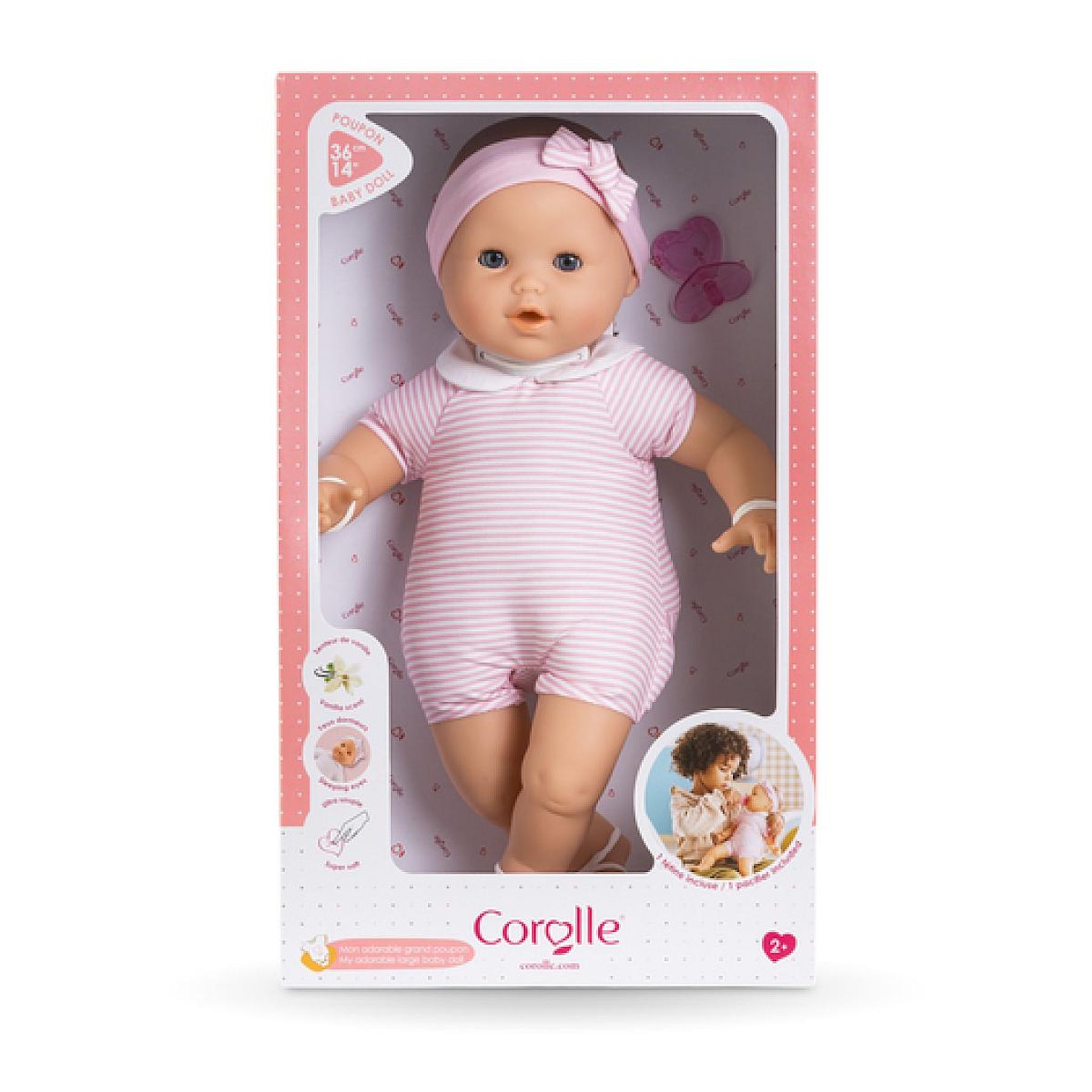 Mon Adorable Grand Poupon est un grand poupon Corolle pour jouer et faire comme les grands. Il mesure 36 cm, une taille parfaitement adaptée aux petits bras de l'enfant pour le câliner, le materner et reproduire les gestes qui font devenir grand. Mon Adorable Grand Poupon a la peau blanche : son visage, ses bras et ses jambes sont en vinyle doux au toucher, à la délicate senteur de vanille. Son corps est souple et léger pour faciliter la manipulation et le jeu. Son pouce peut se maintenir dans sa bouche. Avec ses yeux bleus dormeurs, il fait dodo quand on le couche sur le dos. Habillé d'une toile de corps à rayures roses et blanches, Mon Adorable Grand Poupon se distingue par son col Claudine assorti, directement cousue autour de son cou. Le tout est complété par un bandeau assorti qui ajoute la touche finale à ce look plein de tendresse. Il est accompagné d'une tétine pour l'aider à s'endormir. Mon Adorable Grand Poupon dispose d'une collection complète de vêtements et d'accessoires mon grand poupon Corolle pour imiter les gestes du quotidien et s'inventer des scénarios de jeu multiples et variés. Dès 2 ans.