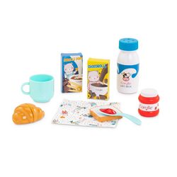 Le Coffret Petit Déjeuner contient tous les accessoires indispensables pour le premier repas de la journée des grands poupons : une tasse, une bouteille de lait (avec bouchon amovible), une cuillère avec de la confiture, un pot de confiture, un croissant (qu'on peut couper en deux), une tartine, une boîte de céréales, une boîte de chocolat en poudre et une serviette en tissu.