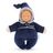 Le doudou Babidoux Marine Rêves d'Étoiles, à la peau blanche et des yeux bleus peints. Il est habillé d'un pyjama et d'un bonnet en velour bleu marine tout doux. À l'intérieur de son bonnet est niché un grelot pour stimuler l'ouïe de bébé. De jolies étoiles brodées dorées et un tissu aux motifs étoiles viennent sublimer ce Babidoux.