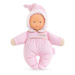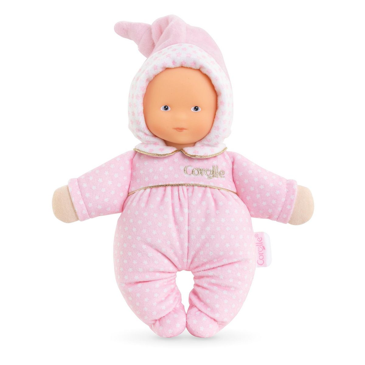 Babidoux : le doudou pour l'éveil des sens.Visage vinyle rassurant. Senteur de vanille réconfortante. 20 cm. Cadeau de naissance idéal. Quand mes parents m'ont tendu le doudou Babidoux pour la première fois, ils l'ont légèrement agité. J'ai tout de suite entendu un petit tintement qui m'a fait sourire. Pour réentendre ce petit bruit, j'ai saisi mon doudou Babidoux par son bonnet, je l'ai fait bouger, et le son du grelot était encore là ! Chaque jour, je reproduis ce mouvement et je cherche d'où il peut bien provenir. J'attrape facilement mon doudou Babidoux par ses bras : il est tellement léger ! Je le sers tout contre moi : j'aime sa grande douceur ! Dès que j'approche mon nez de son visage réaliste et rassurant, je sens la délicate senteur de vanille m'envelopper. Cette odeur permet de me réconforter, même quand mes parents sont loin de moi. Grâce à sa petite taille (20 cm), mon doudou Babidoux se glisse partout, pas question de le quitter ! Mon babidoux et moi, on est inséparables. Car même si je l'oublie quelque part, on me le rendra : il possède une étiquette pour écrire mon prénom ou le numéro de téléphone de mes parents. Le doudou Babidoux Rêves d'Étoiles a la peau blanche et des yeux bleus peints. Il est habillé d'un pyjama à motifs étoiles avec un col claudine et d'un bonnet en velours rose tout doux. À l'intérieur de son bonnet est niché un grelot pour stimuler l'ouïe de bébé. Une jolie broderie dorée vient sublimer ce Babidoux Corolle.Lavable en machine, cycle délicat. mon doudou Corolle : Toi et moi, pour toujours. Dès la naissance.