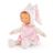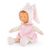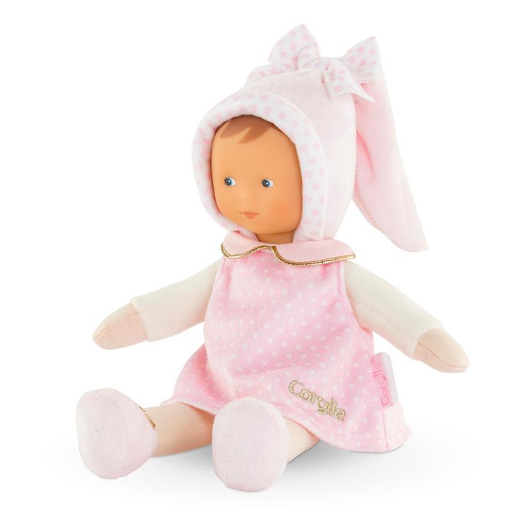 Le doudou Miss Rêves d'Étoiles a la peau blanche et les yeux bleus peints. La Miss est habillée d'une robe rose à imprimé étoiles, elle porte un bonnet beige tout doux et un joli noeud avec des étoiles roses. De jolis détails dorés visibles sur le col claudine, les ballerines et la jolie broderie Corolle viennent sublimer cette Miss.