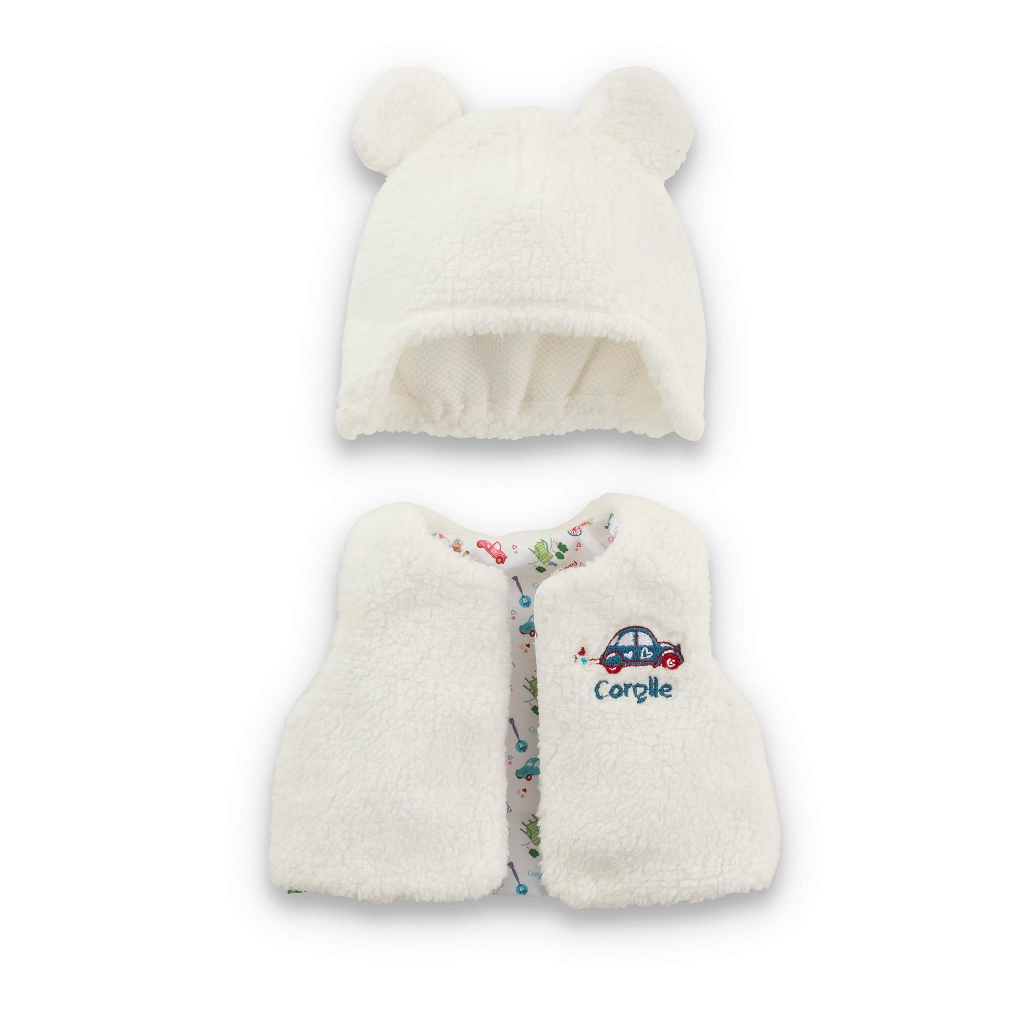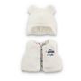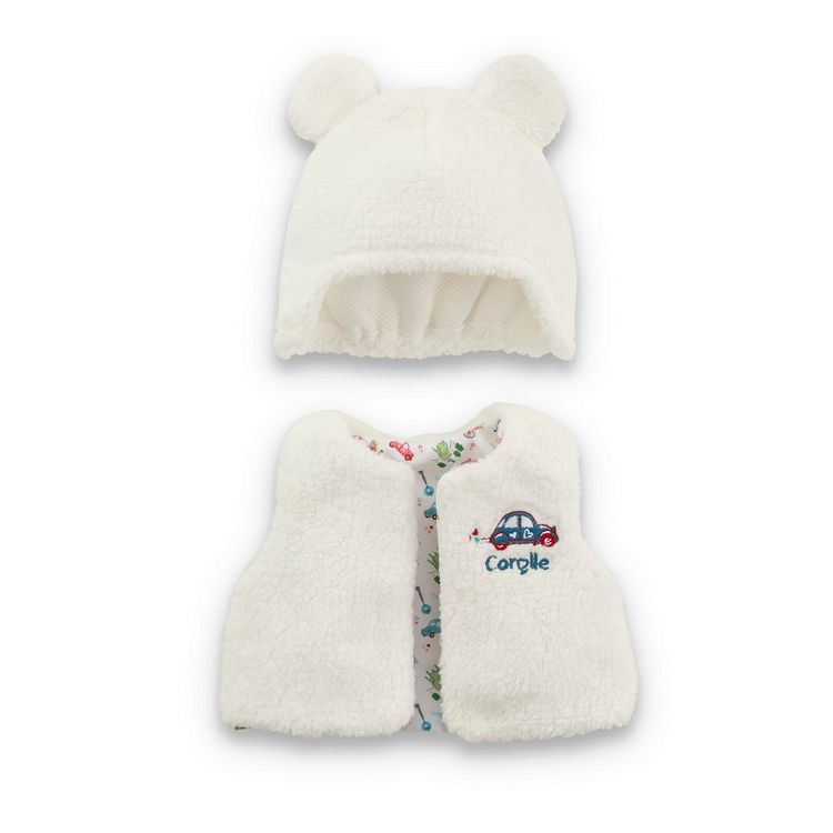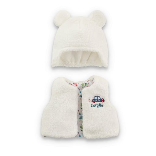 Il est composé d'un joli gilet sans manches, tout doux, réversible et d'un bonnet tout moelleux avec des oreilles d'oursons pour garder son poupon bien au chaud.