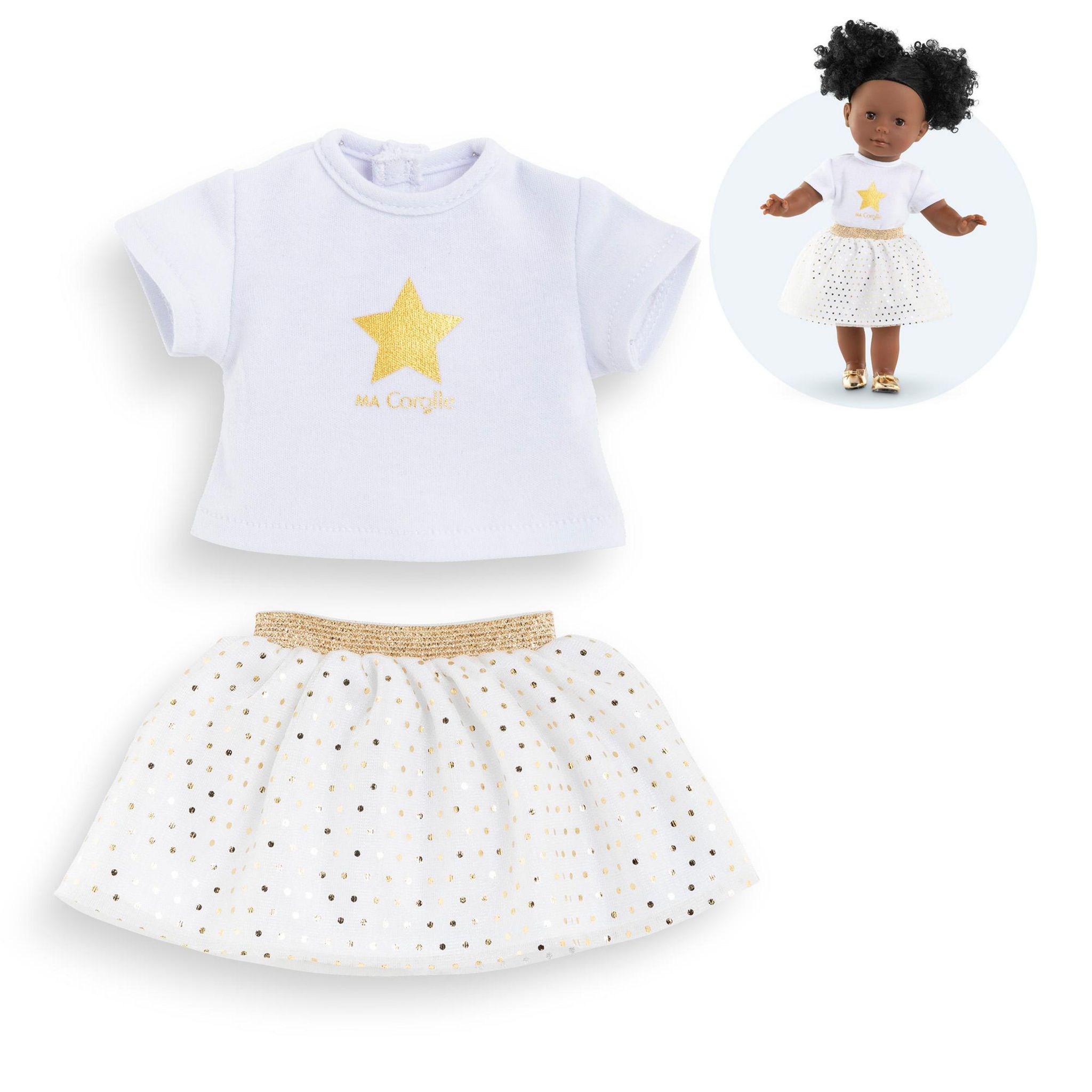 Ce joli ensemble Jupe & T-Shirt Ivoire et Or est parfait pour les poupées ma Corolle de 36 cm. Le t-shirt possède une jolie sérigraphie, d'une étoile dorée. Cette jupe en tulle à petits pois dorés apporte légèreté et délicatesse à cette tenue.Elle est confectionnée dans des matières douces et résist