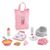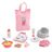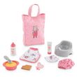 - un pot, un tube de crème, une lingette, une tétine, une couche en tissu, une cuillère, une assiette de purée, un biscuit, un biberon, un bavoir et un tote bag pour tout ranger.