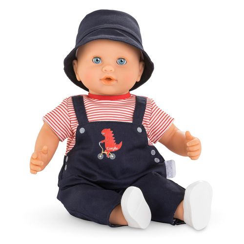 Eliott est le grand poupon Corolle pour jouer et faire comme les grands.Il mesure 36 cm, une taille parfaitement adaptée aux petits bras de l'enfant pour le câliner, le materner et reproduire les gestes qui font devenir grand. Eliott possède tous les attributs d'un poupon Corolle : son visage, ses bras et ses jambes sont en vinyle doux au toucher et possèdent une délicate senteur de vanille réconfortante. Eliott peut s'asseoir tout seul et prendre différentes positions pour s'adapter aux scénarios de jeu. Petit bonus ? Son pouce peut se glisser dans sa bouche, comme un vrai bébé ! Quand on couche Eliott sur le dos, ses yeux bleus se ferment doucement. Un détail magique que les enfants adorent !Ce grand poupon à la peau blanche et les yeux bleus. Il est habillé d'un ensemble tendance : un t-shirt rayé rouge et une salopette bleu marine décorée d'un petit dinosaure amusant.Pour parfaire sa tenue, Il est coiffé d'un joli bob bleu marine et porte de petites chaussures blanches.Eliott dispose d'une collection complète de vêtements et d'accessoires dans la gamme mon grand poupon Corolle, pour imiter les gestes du quotidien et s'inventer des scénarios de jeu multiples et variés. Mon grand poupon Corolle, pour faire comme les grands !Ce poupon ne tient pas debout tout seul. Dès 2 ans.