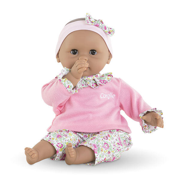 Ce petit poupon, à la peau caramel et aux yeux noirs, est habillé d'une tenue 2-en-1 composée d'un pantalon fleuri et d'un T-Shirt rose aux manches longues, et est coiffé d'un bandeau rose au noeud fleuri assorti à son pantalon. Votre bambin pourra facilement habiller et déshabiller Maria grâce aux bandes auto-agrippantes de sa robe.