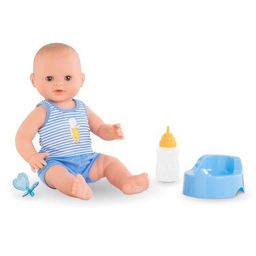 Paul fait pipi est un poupon très réaliste sexué garçon. Comme un vrai bébé, il ferme ses yeux pour faire dodo quand on le couche sur le dos et peut sucer son pouce ou une tétine. Ce poupon tient assis tout seul.Il convient parfaitement aux petits bras de votre enfant, qui pourra le nourrir, le bercer, le câliner... et même le gronder comme un vrai parent !Avec ses 3 accessoires inclus (son pot, son biberon à remplir et sa tétine), ce grand poupon sexué garçon de 36 cm :- boit son biberon qui peut être rempli d'eau,- fait pipi << pour de vrai >> sur son pot lorsqu'on lui appuie sur le ventre,- et prend son bain.Véritable baigneur, ce poupon peut aller dans l'eau en toute confiance, grâce à son corps totalement en vinyle.Comme tous les poupons Corolle, Paul fait pipi possède une délicate senteur de vanille et est en vinyle doux au toucher.Ce poupon petit garçon a la peau blanche et les yeux marron. Il est habillé d'un débardeur rayé bleu à l'imprimé ourson et d'un bloomer bleu.Pour compléter son univers de jeu, Paul Fait Pipi dispose d'une collection complète de vêtements et d'accessoires réalistes. Votre enfant pourra ainsi vous imiter et rejouer les scènes du quotidien, comme lui donner son bain dans la baignoire pour poupon. C'est tout un univers de jeu multiples et variés qui l'attend !Attention, Paul fait pipi ne peut pas porter de bottes. mon grand poupon Corolle, pour jouer et faire comme les grandsCe poupon convient aux enfant dès 2 ans.