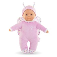 Pti'C?ur Papillon a la peau claire et les yeux bleus fixes. Son pyjama, qui ne peut pas être retiré, est rose, muni d'une élégante collerette. Le dessus de ses pieds, ses antennes et ses ailes sont dans un imprimé très poétique avec des petites fleurs et des papillons. Le Pti'Coeur Papillon a également, sur son dos, de jolies ailes de papillon en tissu aux motifs papillons, pour voler à travers les rêves de bébé. Son petit plus : le bandeau du Pti'Coeur Papillon peut être retiré, mais il reste astucieusement attachée au poupon grâce à une petite languette située derrière la tête, pratique pour éviter de l'égarer !