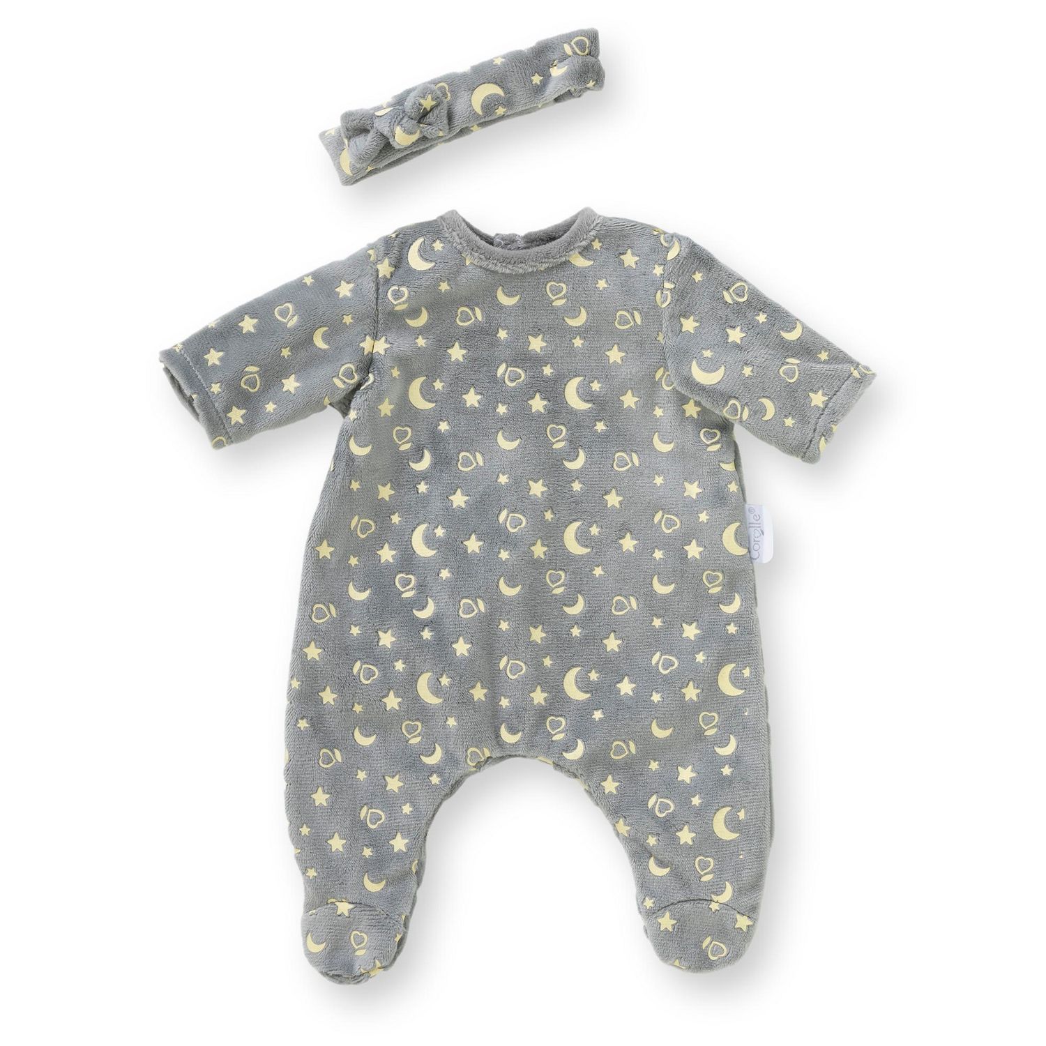 Le marchand de sable est passé, bébé va passer la nuit à faire de jolis et doux rêves !Le Pyjama Brille dans la Nuit, avec son bandeau, est le vêtement idéal pour les grands poupons de 36 cm mon grand poupon Corolle. Ce joli pyjama a été confectionné dans des matières douces et résistantes. De jolie
