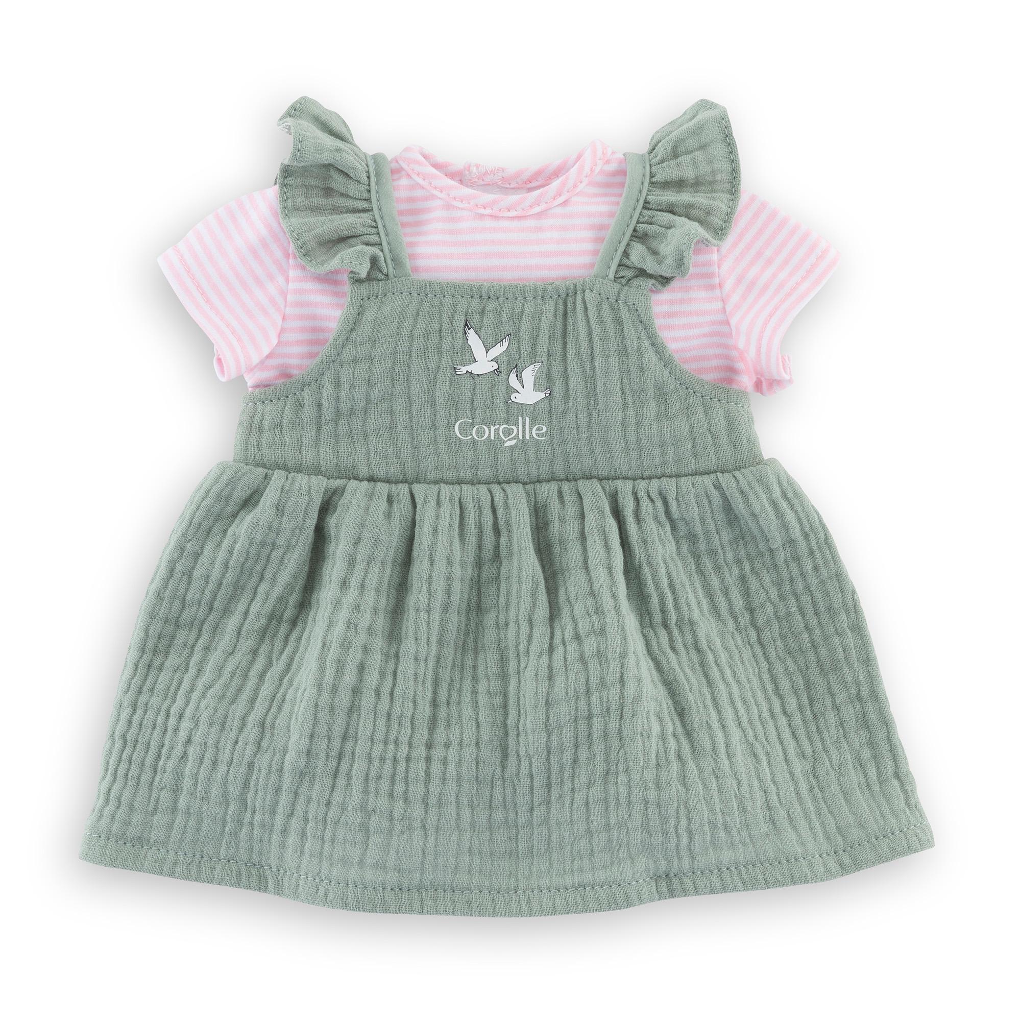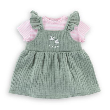 La Robe à volants et T-Shirt Bords de Loire est un vêtement qui convient parfaitement aux grands poupons de 36 cm de la gamme mon grand poupon Corolle.Cette tenue 2-en-1 est composée d'une robe couleur vert sauge, en gaze de coton et d'un T-shirt rayé rose, aux manches courtes, cousu à la robe. Elle