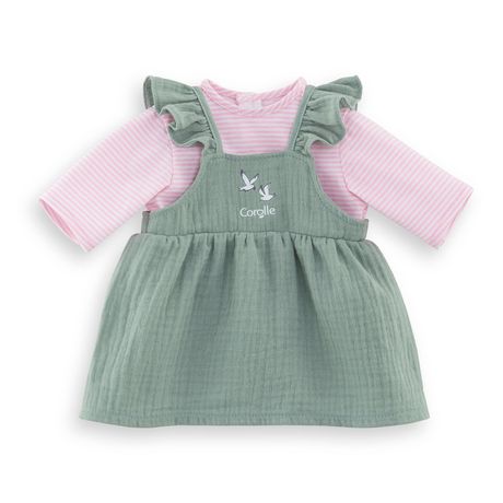 La Robe à volants et T-Shirt Bords de Loire est un vêtement qui convient parfaitement aux grands poupons de 42 cm de la gamme mon grand poupon Corolle.Cette tenue 2-en-1 est composée d'une robe couleur vert sauge, en gaze de coton et d'un T-shirt rayé rose, aux manches longues, cousu à la robe. Elle