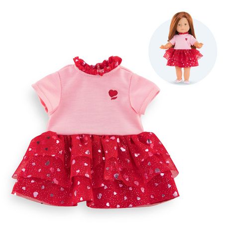 ette jolie robe rouge manches courtes pour poupée ma Corolle présente de belles finitions : le haut de la robe est composé d'un joli t-shirt rose réhuassé d'une broderie cœur Corolle rouge et d'un ravissant col rouge en tulle.