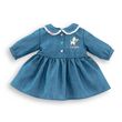 Cette robe bleue, imitation denim, est ornée d'un joli col claudine bordé de volants imprimés dans le tissu exclusif de la collection Week-end à Paris. Sur la poitrine, une adorable sérigraphie de petit chien, accompagné du logo Corolle, apporte une note ludique à la tenue tandis que les petites broderies boutons en forme de coeurs colorés sur le devant accentuent le côté tendre et amusant de la robe.