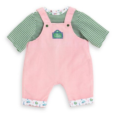 Pour une tenue décontractée, l'ensemble T-shirt et Salopette Week-end à Paris est le vêtement idéal pour les grands poupons de 42 cm mon grand poupon Corolle.Cet ensemble tout-en-un se compose d'une salopette en velours côtelé rose et d'un t-shirt Manches Longues rayé vert et blanc.On y retrouve l