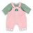 Cet ensemble tout-en-un se compose d'une salopette en velours côtelé rose et d'un t-shirt Manches Longues rayé vert et blanc.