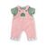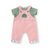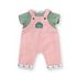 Cet ensemble tout-en-un se compose d'une salopette en velours côtelé rose et d'un t-shirt rayé vert et blanc.