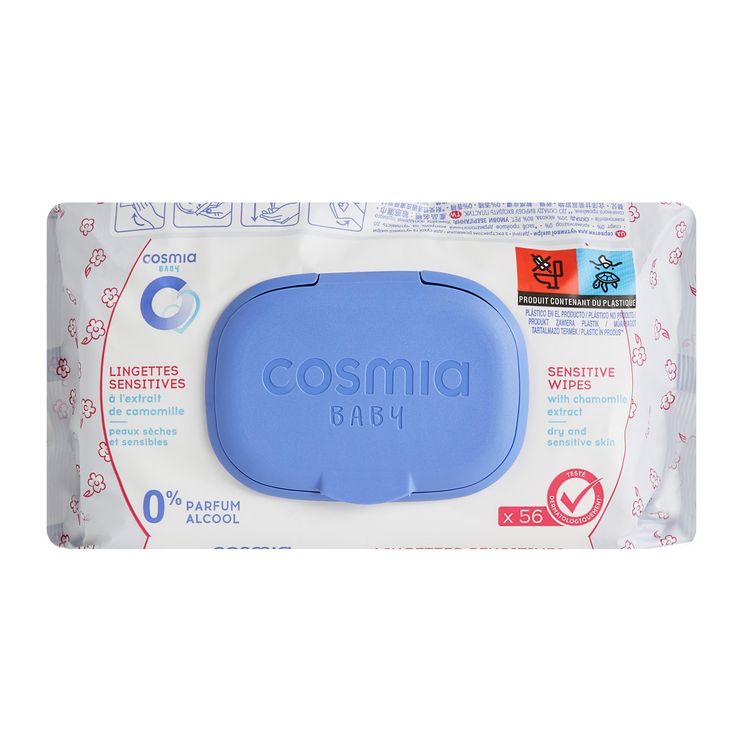 à l'extrait de camomille0% alcool0% parfum.Lingettes sensitives bébéPeaux sèches et sensibles Tolérance testée sous controle dermatologique