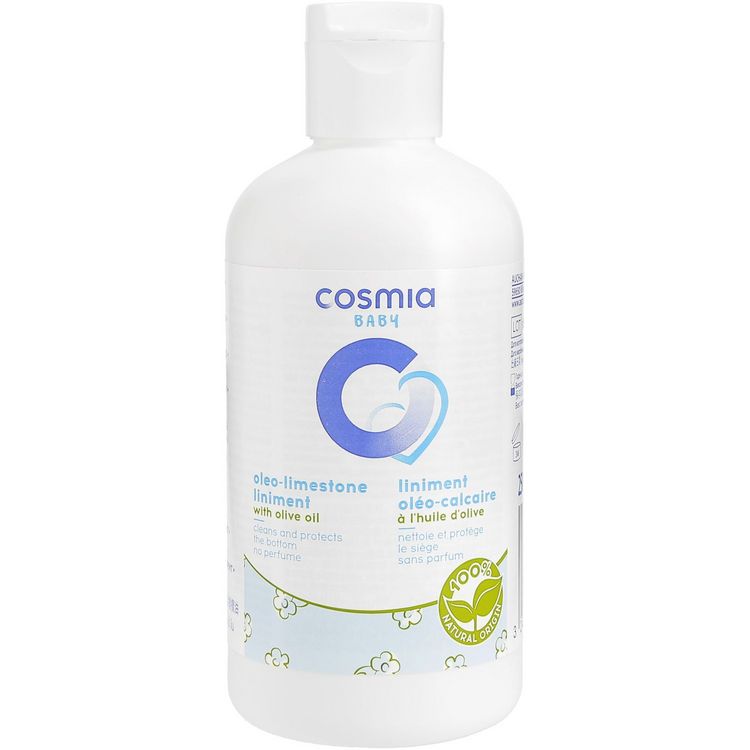 COSMIA BABY oleo liniment a l'huile d'olive 250 ml Votre bébé a une peau délicate et a besoin de soins adaptés. Notre Liniment Oléo Calcaire à l’huile d’olive Cosmia Baby est ultra doux et hypoallergénique*. Avec des ingrédients 100% d'origine naturelle, il nettoie et hydrate en douceur la peau délicate du siège de votre bébé pour la protéger des agressions extérieures. Sans parfum. Ne se rince pas. *formulées de manière à réduire les risques d'allergies. LIMINENT OLEO CALCAIRE