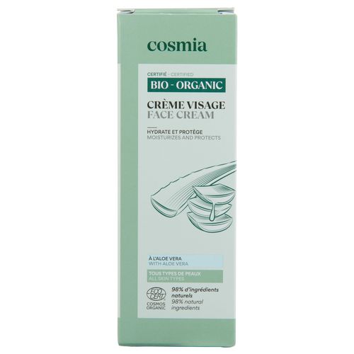 Formulée pour tous les types de peaux, la Crème Hydratante Visage Cosmia à base d'aloe vera offre hydratation et protection de votre peau au quotidien. Ce soin, à base de 98% d'ingrédients d'origine naturelle, et certifié bio, respecte votre peau sans compromis sur l'efficacité. Sa formule vous garantit une composition sûre et un choix rigoureux des ingrédients. Scannez pour découvrir sa note sur votre application de notation favorite! COSMOS ORGANIC certifié par Ecocert Greenlife selon le référentiel COSMOSConseils d'utilisation :Appliquez quotidiennement cette crème sur votre visage et votre cou préalablement nettoyés, en évitant le contour des yeux. Intégrez-la facilement dans votre routine de soin pour une hydratation optimale.