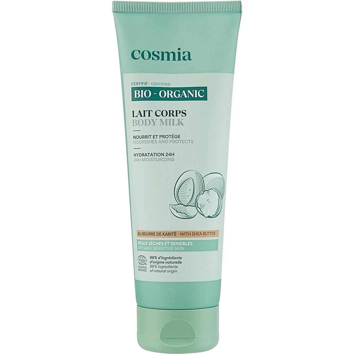 "Formulé pour les peaux sèches et sensibles, le lait corporel nourrissant au beurre de karité de Cosmia hydrate et protège votre peau au quotidien. Certifié biologique, il respecte votre peau sans compromis sur l'efficacité. Sa formule garantit une composition sûre et un choix rigoureux des ingrédients. Scannez pour découvrir sa note sur votre application de notation préférée ! COSMOS ORGANIC certifié par Ecocert Greenlife selon le référentiel COSMOSConseils d'utilisation : Utilisez ce lait quotidiennement.Il s'intègre facilement à votre routine de soins pour une hydratation optimale."COSMOS ORGANIC certifié par ECOCERT Greenlife