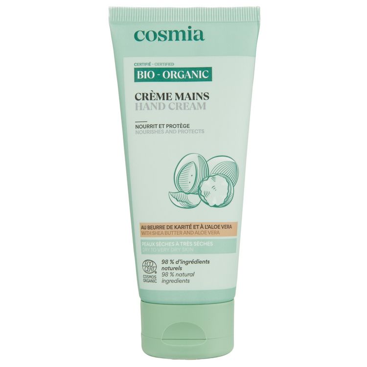 Formulée pour les peaux très sèches, la crème nourrissante pour les mains Cosmia à l'aloe vera hydrate et protège votre peau au quotidien. Certifiée bio, elle respecte votre peau sans compromis sur l'efficacité. Sa formule garantit une composition sûre et un choix rigoureux des ingrédients. Scannez pour découvrir sa note sur votre application de notation préférée ! COSMOS ORGANIC certifié par Ecocert Greenlife selon le référentiel COSMOSConseils d'utilisation : Appliquez lentement cette crème quotidiennement sur vos mains afin de la faire pénétrer dans la peau.Incorporez-la facilement à votre routine de soins pour un hydratation optimale.