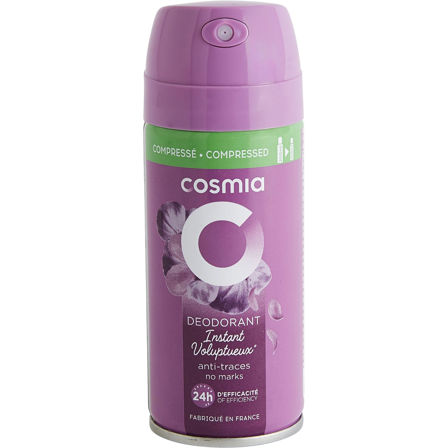 Restez fraîche tout au long de la journée avec ce déodorant spray Instant voluptueux Cosmia. Plus petit et plus pratique, ce format compressé vous offre autant d'utilisations que le format 200mL. Un véritable geste pour l'environnement ! Garanti sans sels d'aluminium, il vous offre une protection 24h, tout en préservant vos vêtements d'éventuelles traces. Son parfum laisse votre peau délicieusement enveloppée de notes fruitées et fait de ce geste un véritable moment de bien-être. Fabriqué en France.