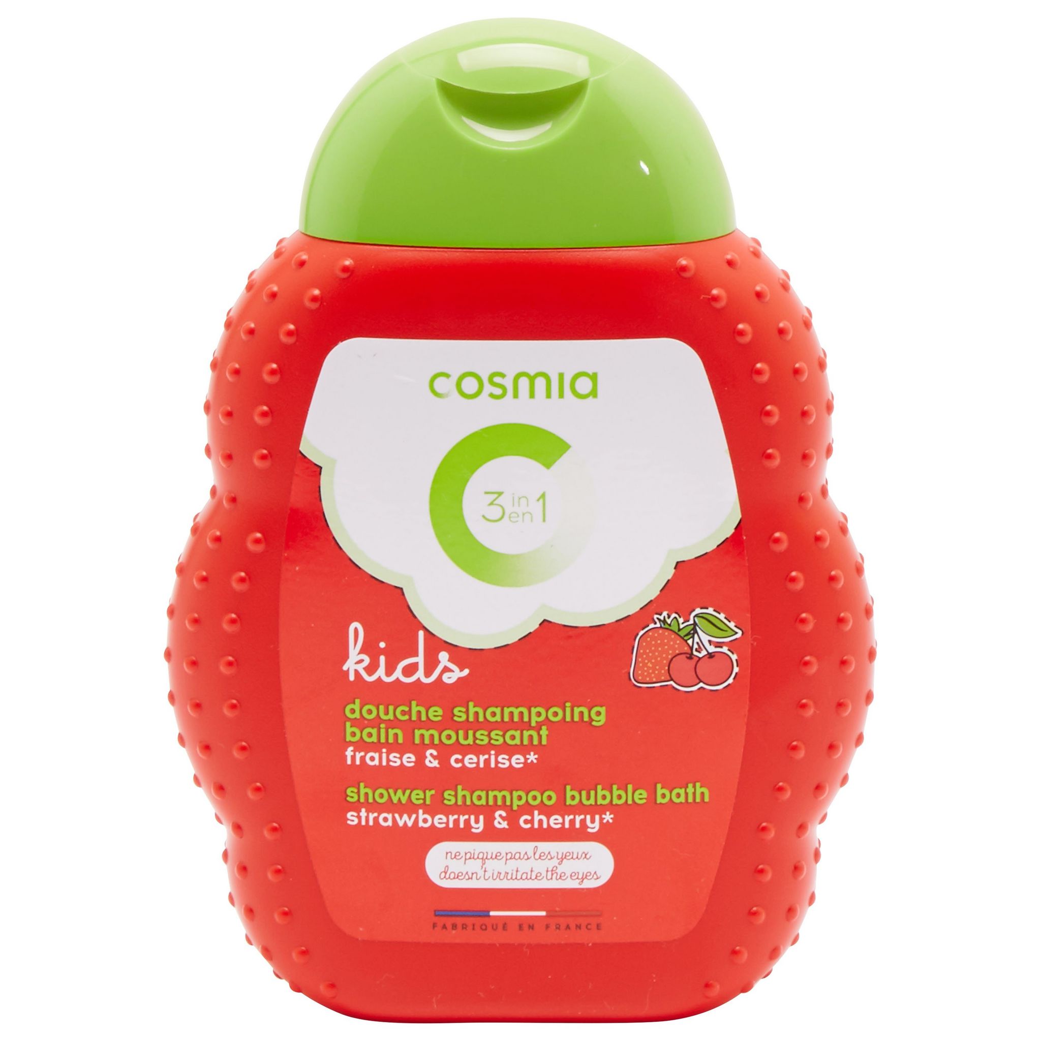 "Et si se laver devenait une partie de plaisir ? Cosmia by Auchanvous propose sa toute nouvelle gamme destinée aux enfants. Des flacons aux formes arrondies, aux couleurs acidulées et aux parfums fruités : abricot, cerise, mangue, pomme... les petits y prendront vite goût. Et parce que chez Auchan, même les produits fun sont pris au sérieux, tous nos composants sont rigoureusement testés et sélectionnés : testés sous contrôle dermatologique, ophtalmologique, non-irritants, sans paraben et ne piquent pas les yeux. Ce produit 3en1 : shampoing, gel douche et bain moussant ultra pratique au parfum de cerise et fraise est à tester sans attendre!"