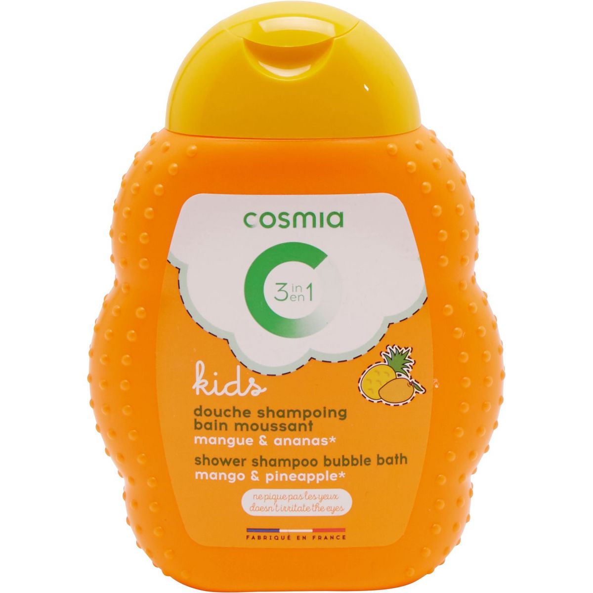 COSMIA K - douche shampoing bain moussant 3 en 1 - mangue et ananas* - Tolérance testée sous contrôle dermatologique et ophtalmologique - 250 m "Et si se laver devenait une partie de plaisir ? Cosmia by Auchan vous propose sa toute nouvelle gamme destinée aux enfants. Des flacons aux formes arrondies, aux couleurs acidulées et aux parfums fruités : abricot, cerise, mangue, pomme... les petits y prendront vite goût. Et parce que chez Auchan, même les produits fun sont pris au sérieux, tous nos composants sont rigoureusement testés et sélectionnés : testés sous contrôle dermatologique, ophtalmologique, non-irritants, sans paraben et ne piquent pas les yeux. Ce produit 3en1 : shampoing, gel douche et bain moussant ultra pratique au parfum de mangue et ananas est à tester sans attendre! "