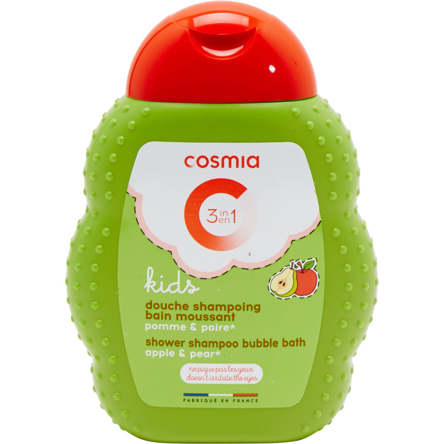 COSMIA KIDS GEL douche shampoing 3 en1 pomme et poire 250ML "Et si se laver devenait une partie de plaisir ? Cosmia by Auchan vous propose sa toute nouvelle gamme destinée aux enfants. Des flacons aux formes arrondies, aux couleurs acidulées et aux parfums fruités : abricot, cerise, mangue, pomme... les petits y prendront vite goût. Et parce que chez Auchan, même les produits fun sont pris au sérieux, tous nos composants sont rigoureusement testés et sélectionnés : testés sous contrôle dermatologique, ophtalmologique, non-irritants, sans paraben et ne piquent pas les yeux. Ce produit 3en1 : shampoing, gel douche et bain moussant ultra pratique au parfum de pomme et poire est à tester sans attendre! "