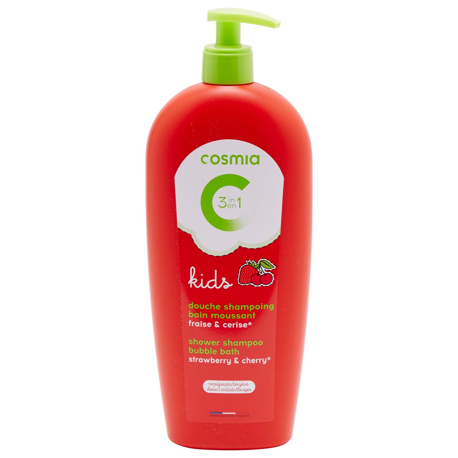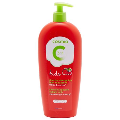 "Et si se laver devenait une partie de plaisir ? Cosmia by Auchanvous propose sa toute nouvelle gamme destinée aux enfants. Des flacons aux formes arrondies, aux couleurs acidulées et aux parfums fruités : abricot, cerise, mangue, pomme... les petits y prendront vite goût. Et parce que chez Auchan, même les produits fun sont pris au sérieux, tous nos composants sont rigoureusement testés et sélectionnés : testés sous contrôle dermatologique, ophtalmologique, non-irritants, sans paraben et ne piquent pas les yeux. Ce produit 3en1 : shampoing, gel douche et bain moussant ultra pratique au parfum de cerise et fraise est à tester sans attendre!"