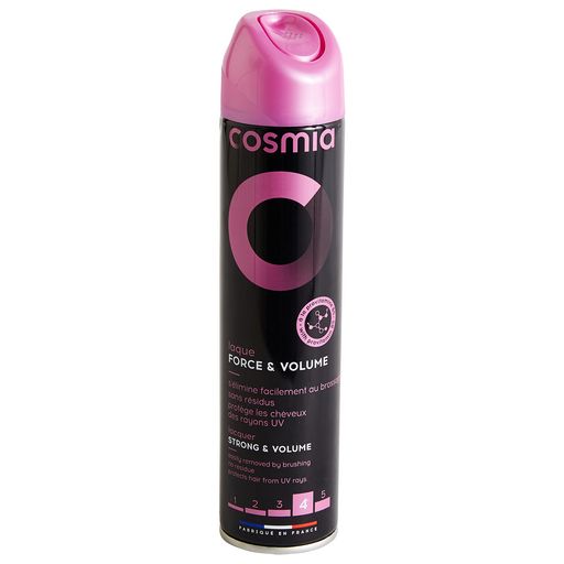 "Osez toutes les coiffures avec la laque force et volume de Cosmia. Offre une tenue longue durée et ne laisse aucun résidu pour des cheveux souples et denses.S'élimine facilement au brossage. Protège les cheveux contre les rayons UV. Fabriqué en France CONSEILS D'UTILISATION : Vaporiser à 20cm de la chevelure de façon homogène. Procéder par pulvérisations brèves. Pour plus de volume, insister sur les racines. Ne pas vaporiser vers les yeux ou une peau irritée."