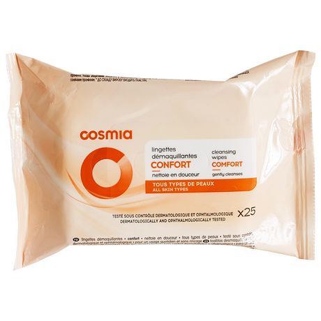 "Les lingettes Cosmia sont conçues pour permettre un démaquillage facile et efficace. En un geste, elles éliminent toutes les traces de maquillage. LA peau est nettoyée et rafraîchie. Fabriqué en Europe Tenir hors de portée des enfants.Usage externe uniquement.Éviter tout contact avec une peau irritée ou une plaie. Ne pas ingérer.Sans rinçage.Éviter le contact direct avec les yeux et les muqueuses.En cas de contact avec les yeux, rincer abondamment à l'eau claire.Eviter l'exposition au soleilConserver au frais et au sec. Éviter le contact avec le soleil. Soulever l'etiquette adhesive. Déplier une lingette imprégnée et démaquillez vous en la passant soigneusement sur le visage, les yeux et le cou."