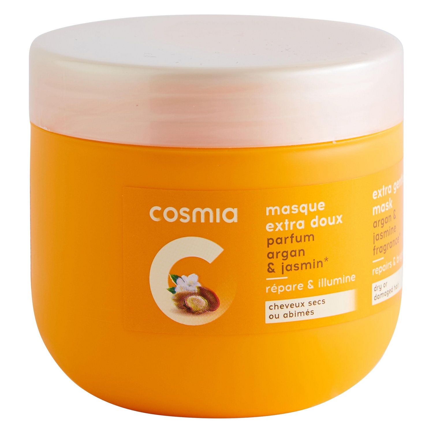 "Le masque extra doux à l'huile d'argan et au jasmin de Cosmia répare et illumine vos cheveux pour les rendre souples et brillants. Fini les cheveux cassants, vos longueurs sont renforcées.Pour cheveux secs et abîmés. Fabriqué en Europe CONSEILS D'UTILISATION :Appliquer uniformement sur les cheveux lavés et essorés, en insistant bien sur les pointes.Laisser poser 2 à 3 minutes.Rincer abondamment. PRECAUTIONS D'EMPLOI :Eviter le contact avec les yeux.En cas de contact avec les yeux, rincer abondamment à l'eau claire.Ne pas ingérer .Tenir hors de portée des enfants."