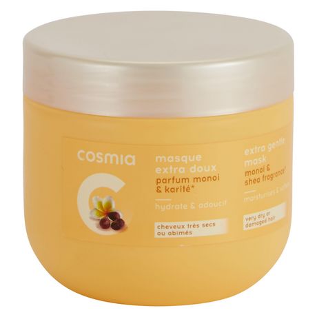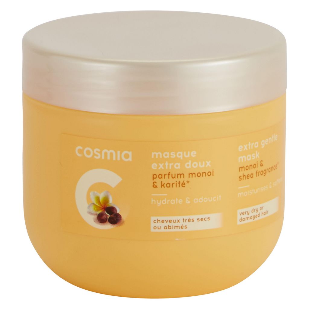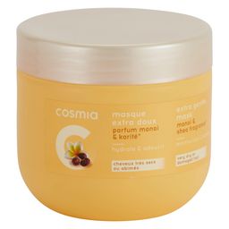 "Grâce au masque extra doux monoï et karité de Cosmia, vos cheveux sont nourris en profondeur et protégés : ils retrouvent brillance et douceur. Sa texture onctueuse n’alourdit pas vos cheveux et laisse un parfum frais.Pour cheveux très secs et abîmés. Fabriqué en Europe CONSEILS D'UTILISATION :Appliquer uniformement sur les cheveux lavés et essorés, en insistant bien sur les pointes.Laisser poser 2 à 3 minutes.Rincer abondamment. PRECAUTIONS D'EMPLOI :Eviter le contact avec les yeux.En cas de contact avec les yeux, rincer abondamment à l'eau claire.Ne pas ingérer .Tenir hors de portée des enfants."