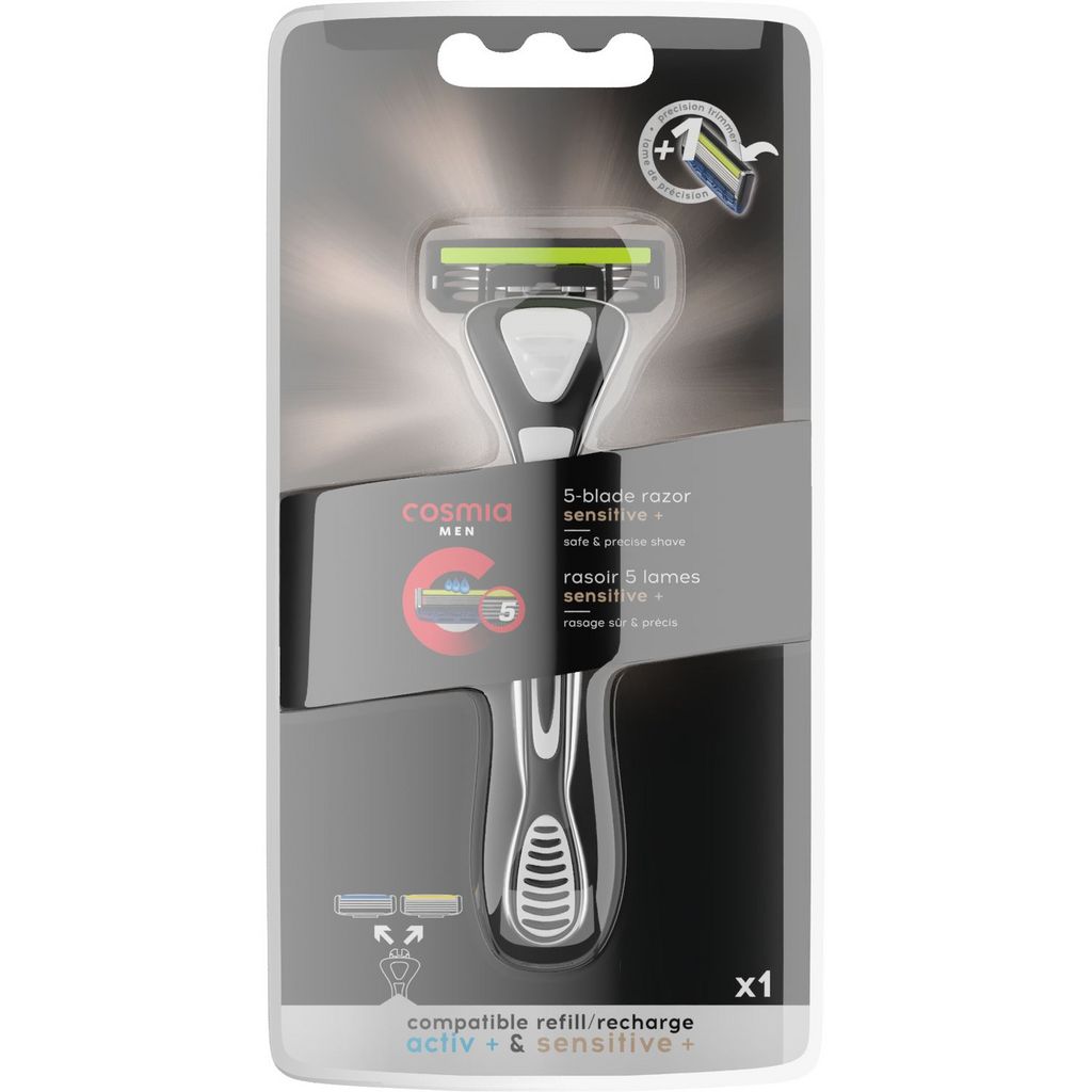 Offrez-vous un rasage précis avec ce rasoir système 5 lames Sensitive+ Cosmia. Conçu spécialement pour répondre aux besoins spécifiques du rasage masculin, il épouse parfaitement les contours du visage et la bande lubrifiante favorise la glisse du rasoir sur la peau. La lame de précision intégrée permet un rasage sûr. Compatible avec les recharges Sensitive+ et activ+