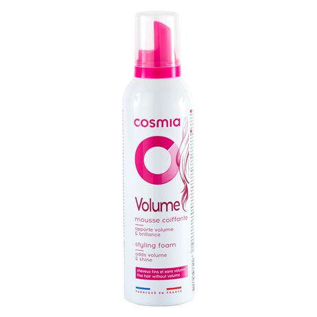 "Osez le volume dans vos coiffures grâce à la mousse coiffante volume de Cosmia. Rend les cheveux souples et brillants. Facile à appliquer, sur cheveux mouillés.Pour cheveux fins et sans volume. Fabriqué en France CONSEILS D'UTILISATION : Répartir une noix de mousse dans les cheveux mouillés, en insistant sur les racines. Sécher à l'aide du séchoir en décollant les racines pour plus de volume. Eviter le contact avec les yeux. PRECAUTIONS D'EMPLOI :Danger : Aérosol extrêmement inflammable.Récipient sous pression: peut éclater sous l'effet de la chaleur.Tenir à l'écart de la chaleur, des surfaces chaudes, des étincelles, des flammes nues et de toute autre source d'inflammation. Ne pas fumer. Ne pas vaporiser sur une flamme nue ou sur toute autre source d'ignition. Ne pas perforer, ni brûler, même après usage. Tenir hors de la porté des enfants. Protéger du rayonnement solaire. Ne pas exposer à une température supérieure à 50°C/122°F"