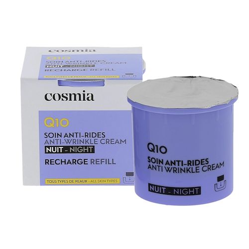 Luttez contre les signes de l'âge la nuit avec la Crème Nuit Anti-Rides Q10 Cosmia, disponible en recharge !Cette crème nuit anti-rides, enrichie en Q10, est spécialement formulée pour aider à réduire visiblement les rides et ridules tout en hydratant votre peau. Efficacité Anti-Rides et Hydratation *:Le coenzyme Q10 est un composé naturellement présent dans le corps humain qui joue un rôle clé dans la production d'énergie au niveau cellulaire. Le Soin visage NuitQ10 Cosmia, adapté à tous les types de peaux, aide à réduire les rides, et améliore la fermeté de la peau, en plus de l'hydrater. Format Recharge:Adoptez une démarche permettant d'allier bien être et réduction des déchets plastiques, le tout à petit prix. -78% de plastique par rapport au pot classique du Soin Eclat Glow 50ml.Recharge compatible avec les soins visage Cosmia Q10 50ml. Sécurité de nos formules Ce soin visage Q10 vous garantit une composition sûre et un choix rigoureux des ingrédients. Scannez pour découvrir sa note sur votre application de notation favorite! Conseils d'utilisation: Appliquez une noisette de soin sur votre visage et votre cou parfaitement nettoyés, du centre vers l'extérieur, en massages circulaires, jusqu'à absorption complète. *Auto-évaluation réalisée sur 20 personnes