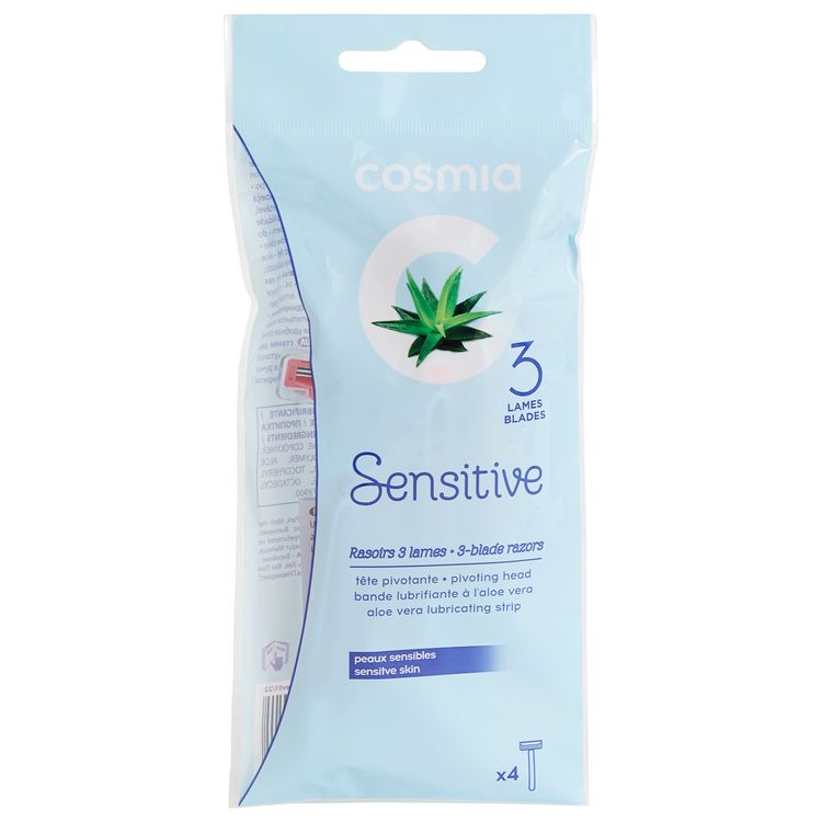rasoir 3 lames bande lubrifiante à l'aloe veratête pivotante peaux sensiblesx4rasage précis et confortable adapté aux contours du corpspeaux sensibles manche antidérapant pour une bonne prise en main