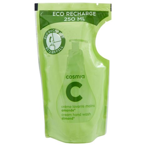 COSMIA eco recharge savon main amande 250ML Faites un geste pour l'environnement avec cette éco-recharge Cosmia conçue pour recharger un flacon pompe. Légère et onctueuse, cette crème nettoie la peau efficacement, sans l'assécher. Vos mains sont enveloppées d'un délicieux parfum d'amande. Testé sous contrôle dermatologique.