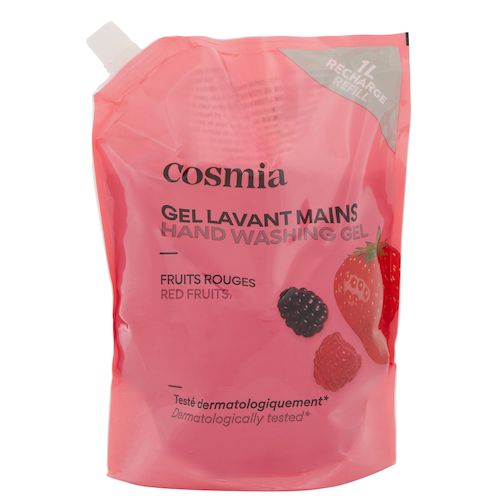 "Découvrez le Gel Lavant Mains Fruits Rouges, pour des mains douces et délicatement parfumées,disponible au format recharge 1L.Naturalité et Sécurité de nos formulesCe Gel Lavant Mains Cosmia contient 95.2% d'ingrédients d'origine naturelle.Testé sous contrôle dermatologique, il vous garantit une composition sûre et un choix rigoureux des ingrédients. Scannez pour découvrir sa note sur votre application de notation favorite! Format Recharge Adoptez une démarche permettant d'allier bien être et réduction des déchets plastiques, à un prix avantageux. Avec notre format recharge de 1L, vous réduisez vos déchets plastiques de 83% par rapport à l'utilisation de 3 bouteilles 300ml. Réutilisez votre flacon préféré tout en continuant à profiter de votre gel lavant main favori.Conseils d’utilisation :Appliquez une noisette de savon sur mains mouillées, frottez pendant une minute puis rincez."