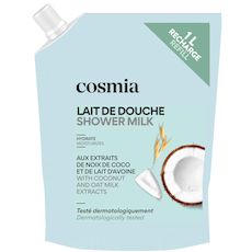 Laissez vous envelopper par la douceur du Lait de Douche aux Extraits de Noix de Coco et de Lait d'Avoine Cosmia pour une peau hydratée jour après jour, disponible en format recharge 1L. Parfum Exotique et Réconfortant :Laissez-vous transporter par le parfum envoûtant de la coco et la douceur réconfortante du lait d'avoine, pour une sensation d'évasion et de bien-être à chaque douche. Votre peau est enveloppée d'un voile délicatement parfumé, vous offrant un moment de pure détente.Hydratation de la peau Ce lait de douche nettoie votre peau et l'hydrate en douceur. Naturalité et Sécurité de nos formulesLe Lait de Douche aux Extraits de Noix de Coco et de Lait d'Avoine contient 95.1% d'ingrédients d'origine naturelle.Testé sous contrôle dermatologique, ce gel douche vous garantit une composition sûre et un choix rigoureux des ingrédients. Scannez pour découvrir sa note sur votre application de notation favorite! Format Recharge Adoptez une démarche permettant d'allier bien être et réduction des déchets plastiques, à un prix avantageux. Avec notre format recharge de 1L, vous réduisez vos déchets plastiques de 85% par rapport à l'utilisation de 4 bouteilles de 250 mL. Réutilisez votre flacon préféré tout en continuant à profiter de votre gel douche dermo-protecteur favori.Utilisation Quotidienne :Transformez chaque douche en un moment de plaisir sensoriel. Appliquez une noix de gel douche sur votre peau humide, faites mousser délicatement, puis rincez abondamment. Sa mousse légère et onctueuse se rince facilement, pour une sensation de confort et de bien-être.