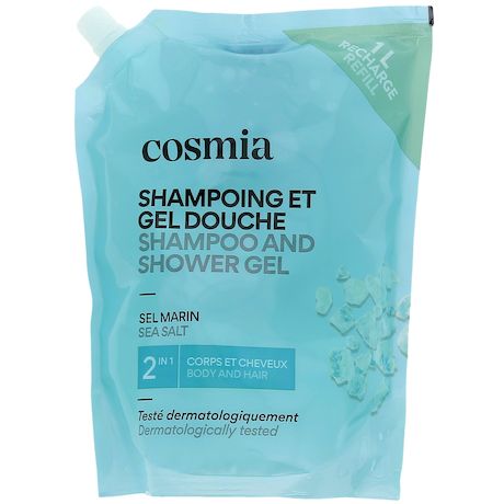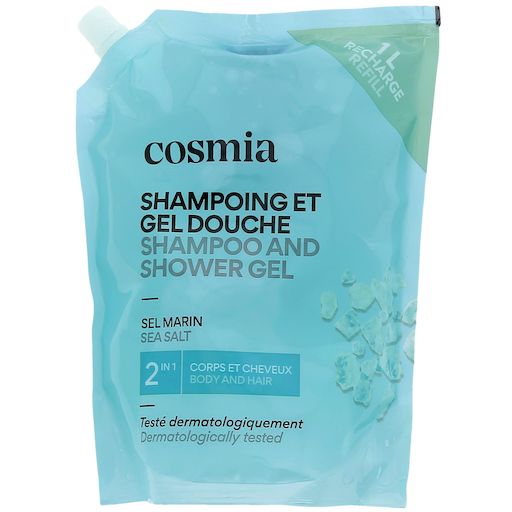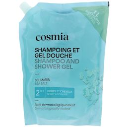 Voyagez au cœur de l'océan avec le Shampoing et Gel Douche Cosmia au sel marin, pour une expérience rafraîchissante sous la douche, disponible au format recharge 1L.Parfum Rafraîchissant :Laissez-vous transporter par le parfum vivifiant de ce gel douche, qui vous plonge dans une ambiance océanique rafraîchissante. Chaque douche devient un moment de pure évasion, enveloppant votre peau et vos cheveux d'un parfum marin.2 en 1 Pratique :Ce produit combine les bienfaits d'un shampoing et d'un gel douche dans une seule formule pratique, idéale pour simplifier votre routine de soins. Vous pouvez ainsi nettoyer votre corps et vos cheveux en un seul geste, gagnant du temps et de l'espace dans votre salle de bain.Naturalité et Sécurité de nos formulesLe Gel Douche 2en1 Sels Marins Cosmia contient 93.9% d'ingrédients d'origine naturelle.Testé sous contrôle dermatologique, ce gel douche vous garantit une composition sûre et un choix rigoureux des ingrédients. Scannez pour découvrir sa note sur votre application de notation favorite! Format Recharge Adoptez une démarche permettant d'allier bien être et réduction des déchets plastiques, à un prix avantageux. Avec notre format recharge de 1L, vous réduisez vos déchets plastiques de 85% par rapport à l'utilisation de 4 bouteilles de 250 mL. Réutilisez votre flacon préféré tout en continuant à profiter de votre gel douche dermo-protecteur favori.Utilisation Quotidienne :Transformez chaque douche en un moment de plaisir sensoriel. Appliquez une noix de gel douche sur votre peau humide, faites mousser délicatement, puis rincez abondamment. Sa mousse légère et onctueuse se rince facilement, pour une sensation de confort et de bien-être.