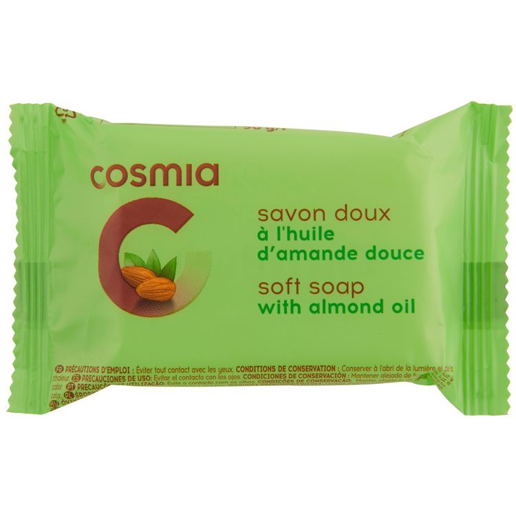 Ce savon doux Cosmia deviendra vite un incontournable de votre salle de bain ! Sa formule enrichie en huile d'amande douce lave la peau en douceur et convient parfaitement à tous les types de peaux. Fabriqué en Europe
