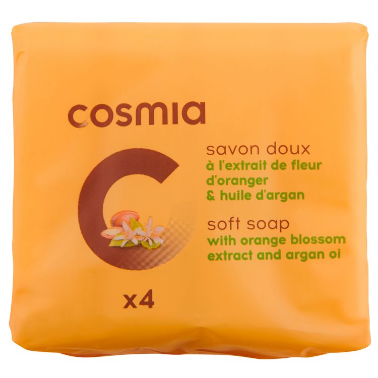Ce savon doux Cosmia deviendra vite un incontournable de votre salle de bain ! Sa formule enrichie en huile d'argan et fleur d'oranger lave la peau en douceur et convient parfaitement à tous les types de peaux. Fabriqué en Europe