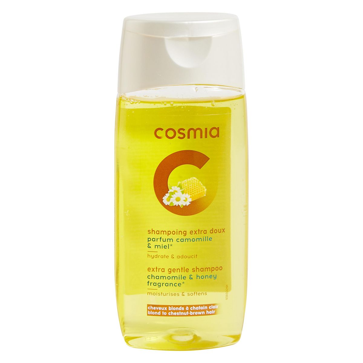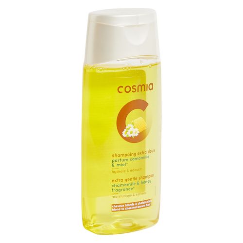 "Le shampoing extra doux à la camomille et au miel de Cosmia adoucit et hydrate vos cheveux pour les rendre brillants et soyeux. Sa texture onctueuse n'alourdit pas le cheveu et laisse un léger parfum sucré.Pour cheveux blonds à chatain clair. Fabriqué en Europe CONSEILS D'UTILISATION :Appliquer sur cheveux mouillés, masser soigneusement, puis rincer abondamment. PRECAUTIONS D'EMPLOI :Eviter le contact avec les yeux.En cas de contact avec les yeux, rincer abondamment à l'eau claire.Ne pas ingérer .Tenir hors de portée des enfants."