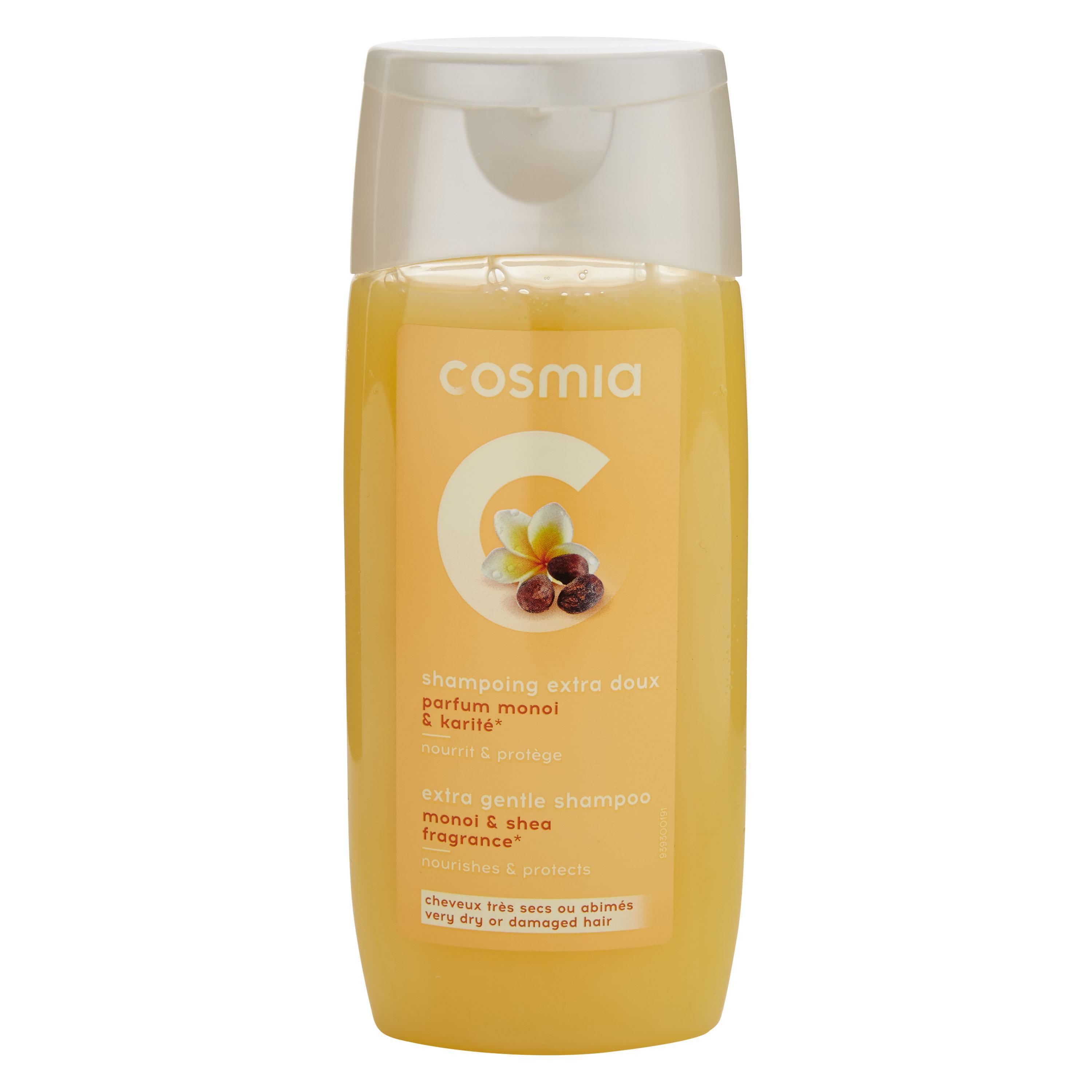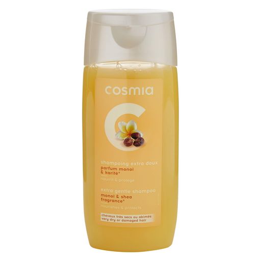 "Grâce au shampoing extra doux monoï et karité de Cosmia, vos cheveux sont nourris en profondeur et protégés. Ils retrouvent brillance et douceur. Sa texture onctueuse n’alourdit pas vos cheveux et laisse un parfum frais.Pour cheveux très secs et abîmés. Fabriqué en Europe CONSEILS D'UTILISATION :Appliquer sur cheveux mouillés, masser soigneusement, puis rincer abondamment. PRECAUTIONS D'EMPLOI :Eviter le contact avec les yeux.En cas de contact avec les yeux, rincer abondamment à l'eau claire.Ne pas ingérer .Tenir hors de portée des enfants."