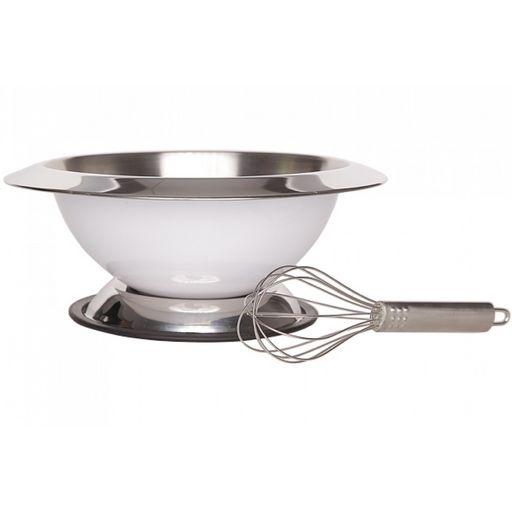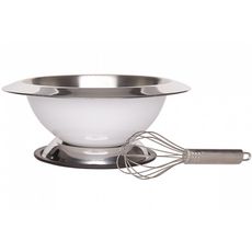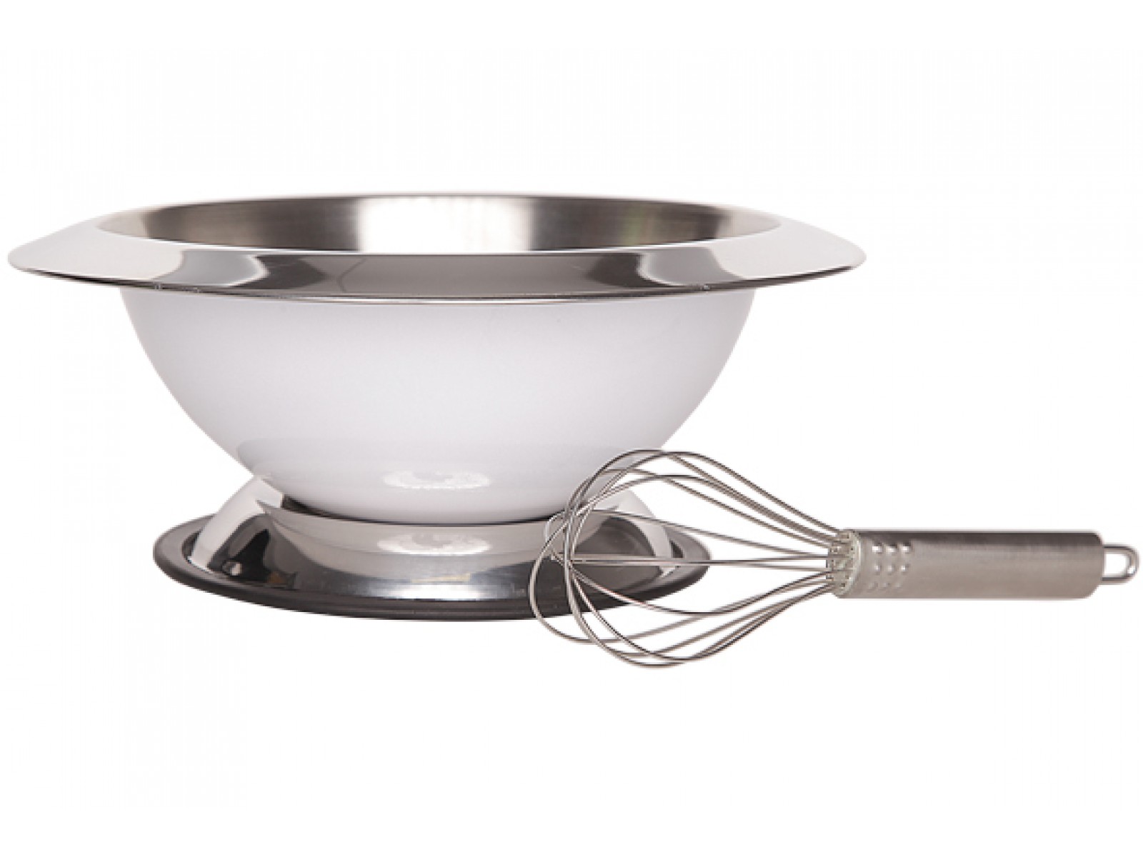 Bol mélangeur en inox avec base et fouet. Grâce à cet accessoire de cuisine vous pourrez battre et mélanger vos ingrédients super facilement et avec une grande stabilité.