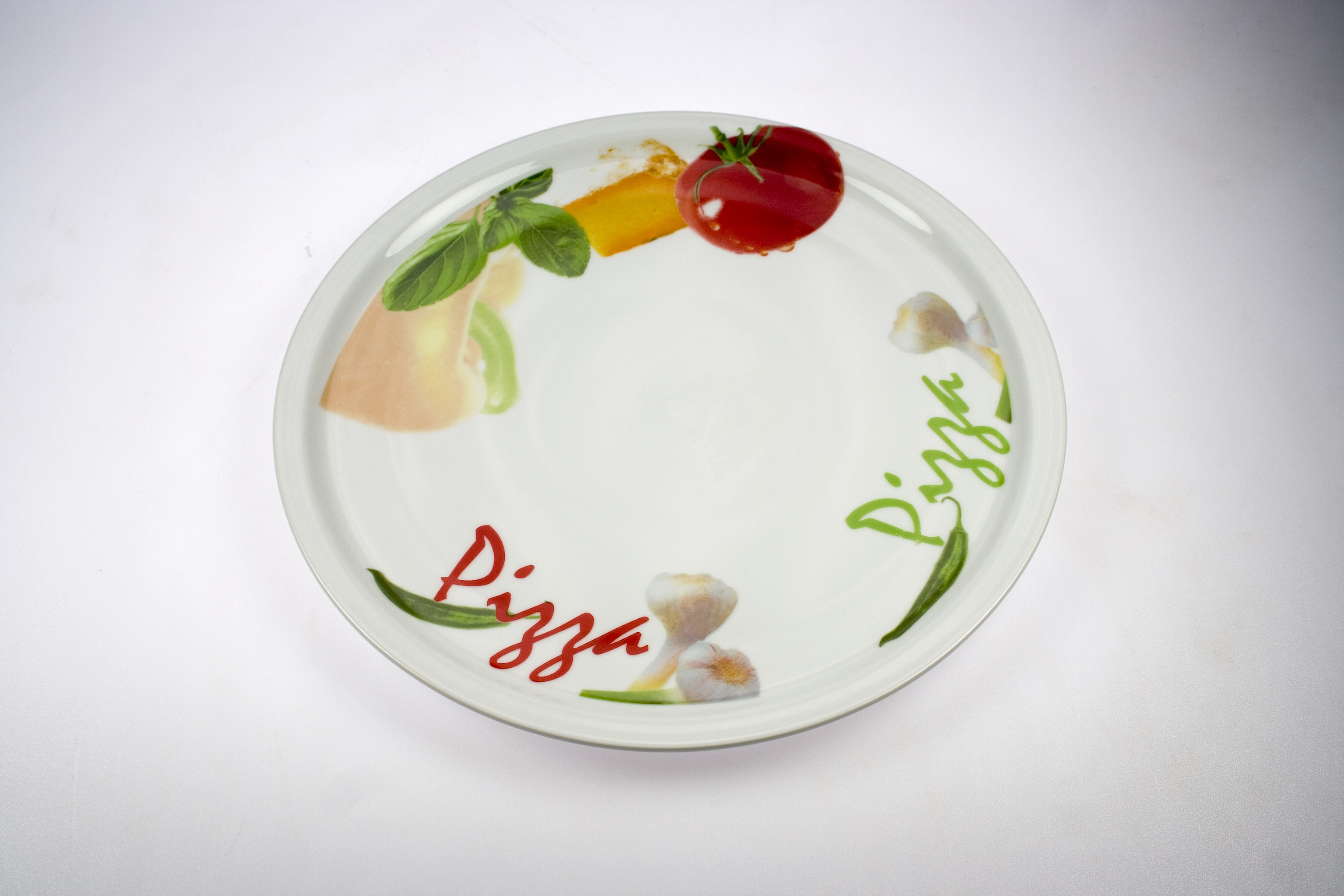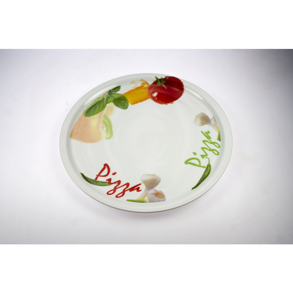 Savourez vos merveilleuses pizza dans ces grandes assiettes à pizza de 30 cm. Un imprimé simple et frais sur le thème de la pizza.