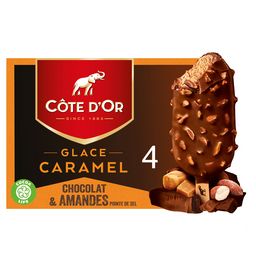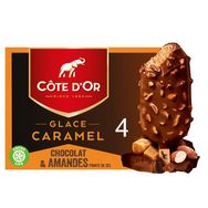 Découvrez toute l'intensité des tablettes de chocolat Côte d'Or dans une nouvelle offre en glace. Un bâtonnet gourmand au caramel, enrobé d'une épaisse coque de chocolat Côte d'Or et de généreux morceaux d'amandes pointe de sel. Les glaces Côte d'Or, le plaisir à l'état brut.
